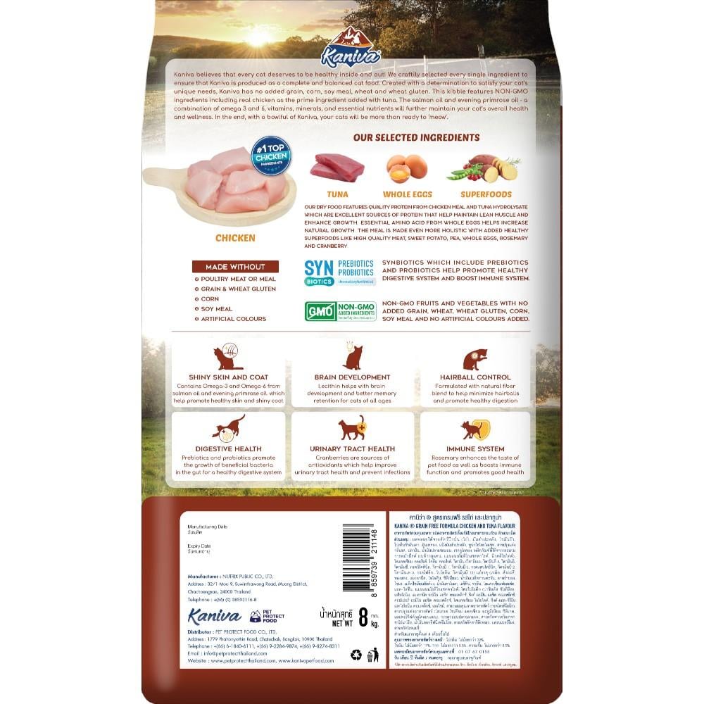 - المكونات الأساسية للمنتج: دجاج طازج، تونة عالية الجودة، بطاطا، بازلاء، زيت السلمون، فواكه وخضروات طبيعية، معادن، فيتامينات، وتورين.