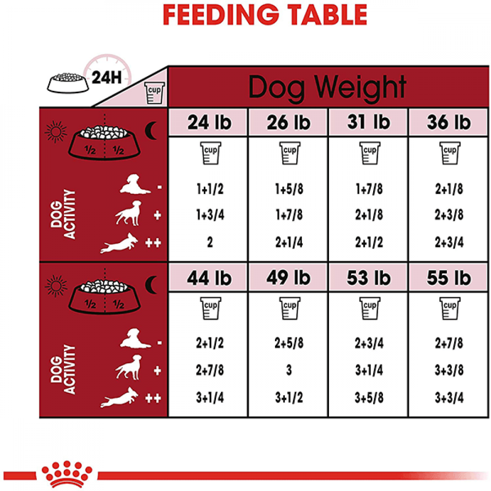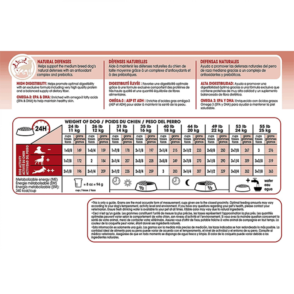 - يتم تحديد الحصة اليومية حسب وزن الكلب ومستوى نشاطه، ويمكن الاطلاع على جدول التغذية على العبوة.
