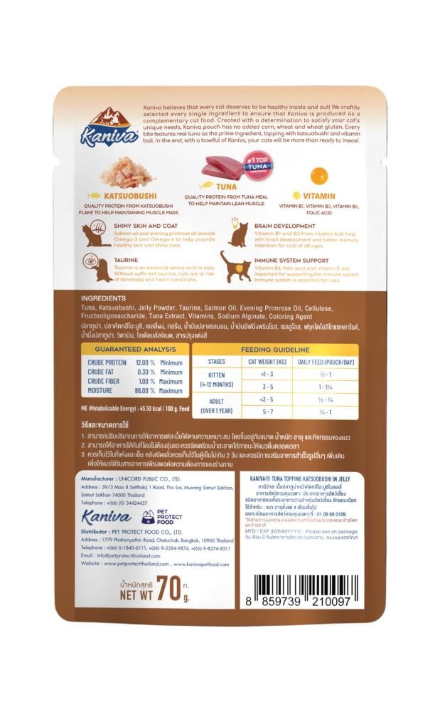 وفّر لقطك تغذية متكاملة ونكهة لا تقاوم مع Kaniva cat food بنكهة كانيفا تونة و كاتسوبوشي في الجيلي. كل ظرف يحتوي على وجبة لذيذة تجمع بين التونة الطازجة وقطع الكاتسوبوشي الشهية في جيلي غني، مدعّم بكرات الفيتامينات والزيوت الصحية لدعم صحة الفرو والجلد، وتعزيز صحة القلب والعين، وتقوية المناعة.