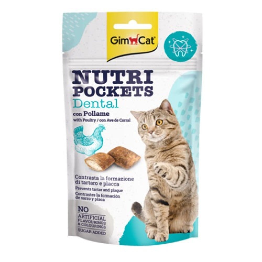 إن الوجبات الخفيفة للقطط GimCat Nutri Pockets Dental مصنوعة من فتات مقرمشة مع حشوة لذيذة خاصة بصحة الأسنان.