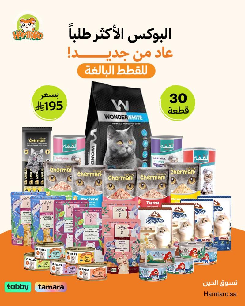 قطتك فرد من العيلة، دلليها ببكج قطط متكامل يجمع الراحة واللعب والأكل الصحي في بوكس واحد، يوفّر للحيوانات الأليفة كل احتياجاتهم اليومية بأسلوب عملي وشيك، ويوفّر عليكِ وقت ومجهود الاختيار.