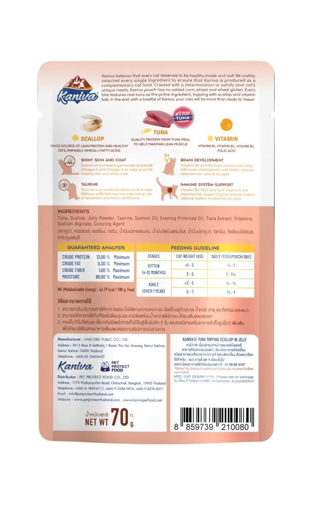 لمن يبحث عن طعام فاخر ومغذي لقطه، يأتي كانيفا طعام للقطط بالتونة مع الإسكالوب في الجيلي ليجمع بين المذاق الرائع والفوائد الصحية. يحتوي هذا المنتج على تونة طازجة وإسكالوب شهي في جيلي ناعم، مدعّم بكريات الفيتامين لتعزيز صحة قطك في كل وجبة.