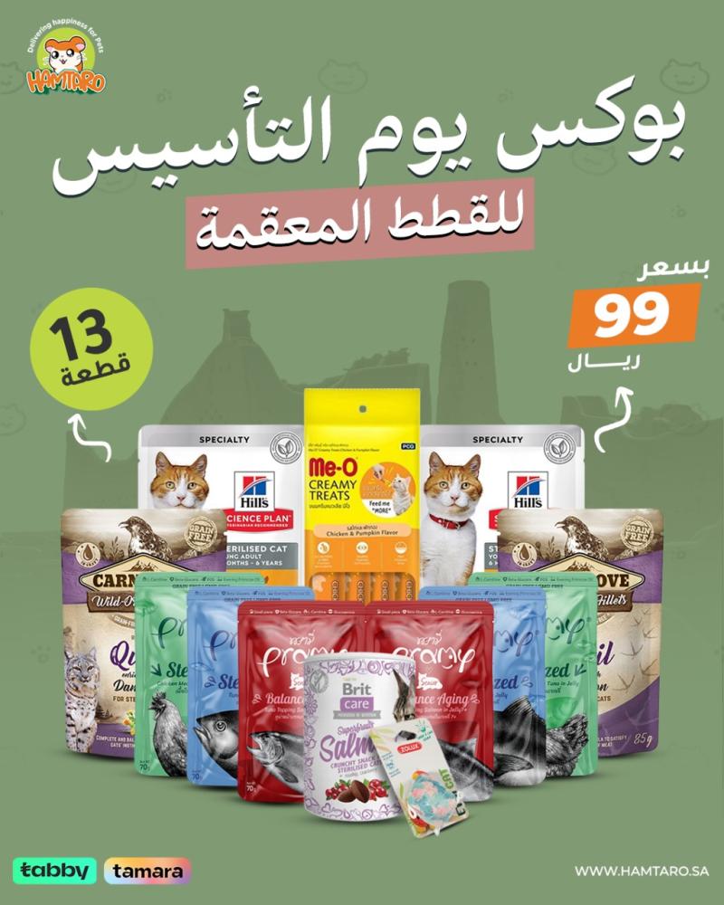 لأننا نهتم بقطتك بقدر اهتمامك بها، نقدم لك بوكس يوم التأسيس الاقتصادي للقطط المعقمة بسعر مميز يناسب الجميع، دون أي تنازل عن الجودة أو التميز، كل ما تحتاجه قطتك في صندوق واحد يمنحها تغذية متكاملة، لحظات من السعادة، وراحة البال لك.