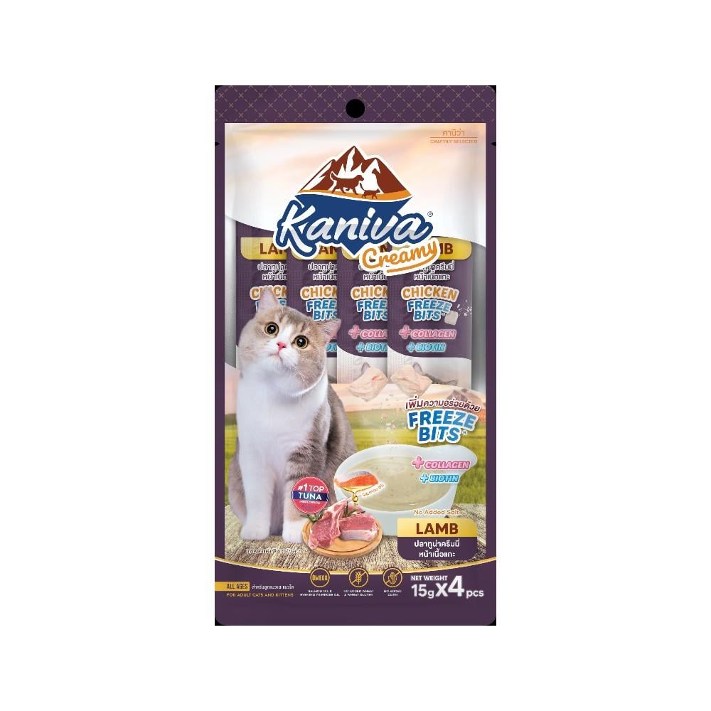 - كانيفا مكافأة كريمية للقطط مصنوعة من لحوم حقيقية كمكون رئيسي لضمان الطعم والجودة.