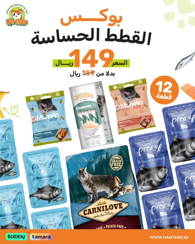 - 8 عبوات من برامي طعام القطط: وصفات غنية بالبروتين وسهلة الهضم، خالية من المكونات الصناعية، تعتني بالجهاز الهضمي والبشرة.