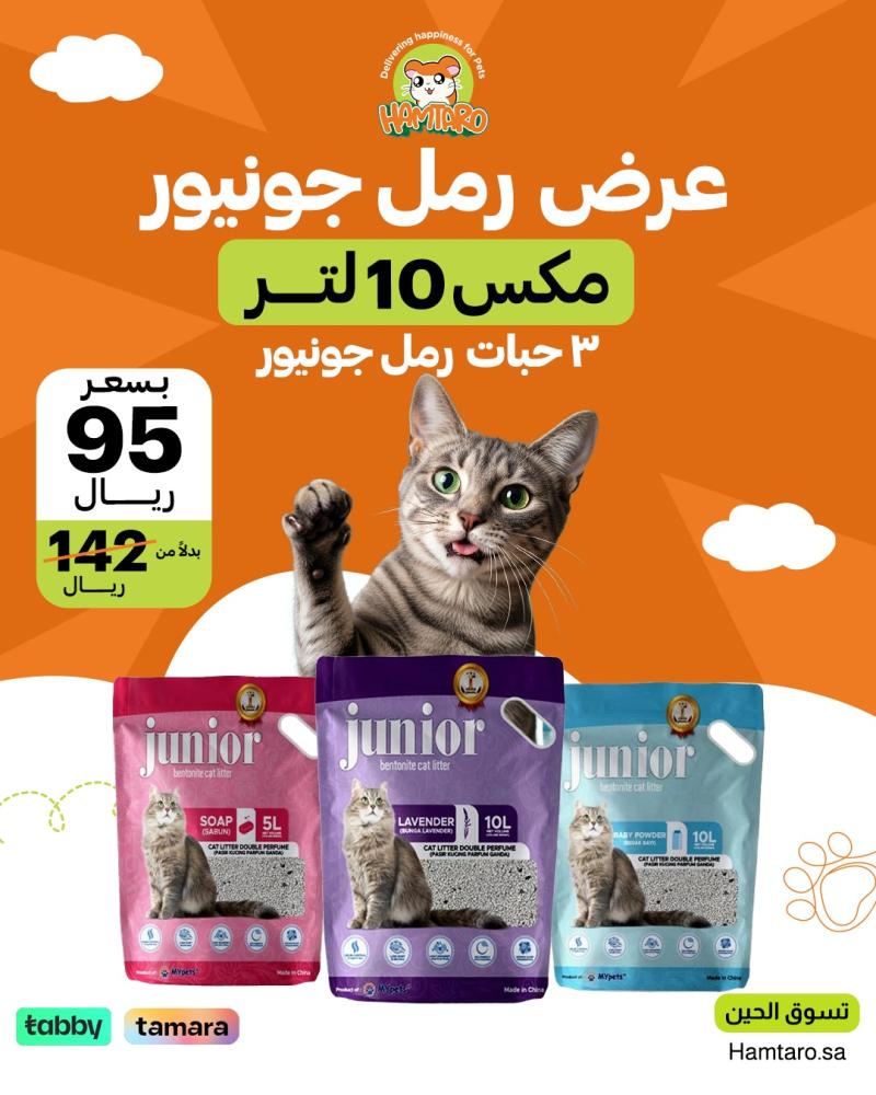 إذا كنت تبحث عن حل متكامل لنظافة قطتك وراحة منزلك، فإن عرض اليوم الوطني من رمل القطط جونيور مكس 10 لتر هو الاختيار الأفضل لك، هذا العرض يجمع بين الجودة العالية والتنوع المميز في الروائح، حيث يقدم لك باقة متكاملة من أفضل منتجات رمل جونيور الموثوقة