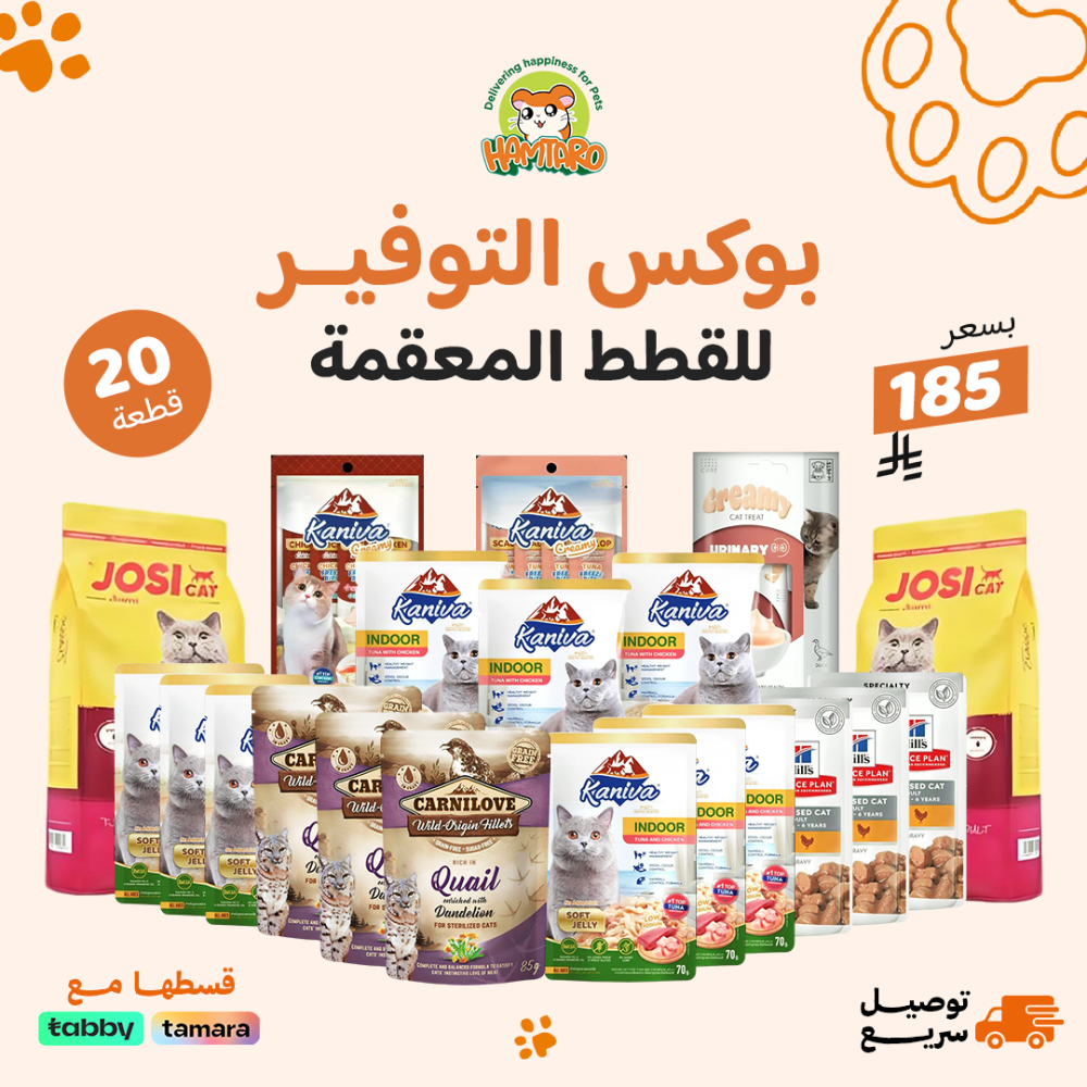بوكس التوفير للقطط المعقمة هو الحل الذكي لكل من يبحث عن تغذية متوازنة وصحية للقطط بعد التعقيم. يحتوي هذا البوكس المتكامل على مجموعة متنوعة من الأطعمة والمكافآت من أشهر الماركات مثل Kaniva، Carnilove، JosiCat، Hill’s، Royal Canin، لتمنح قطتك تجربة غذائية غنية بالطعم والفائدة في آنٍ واحد