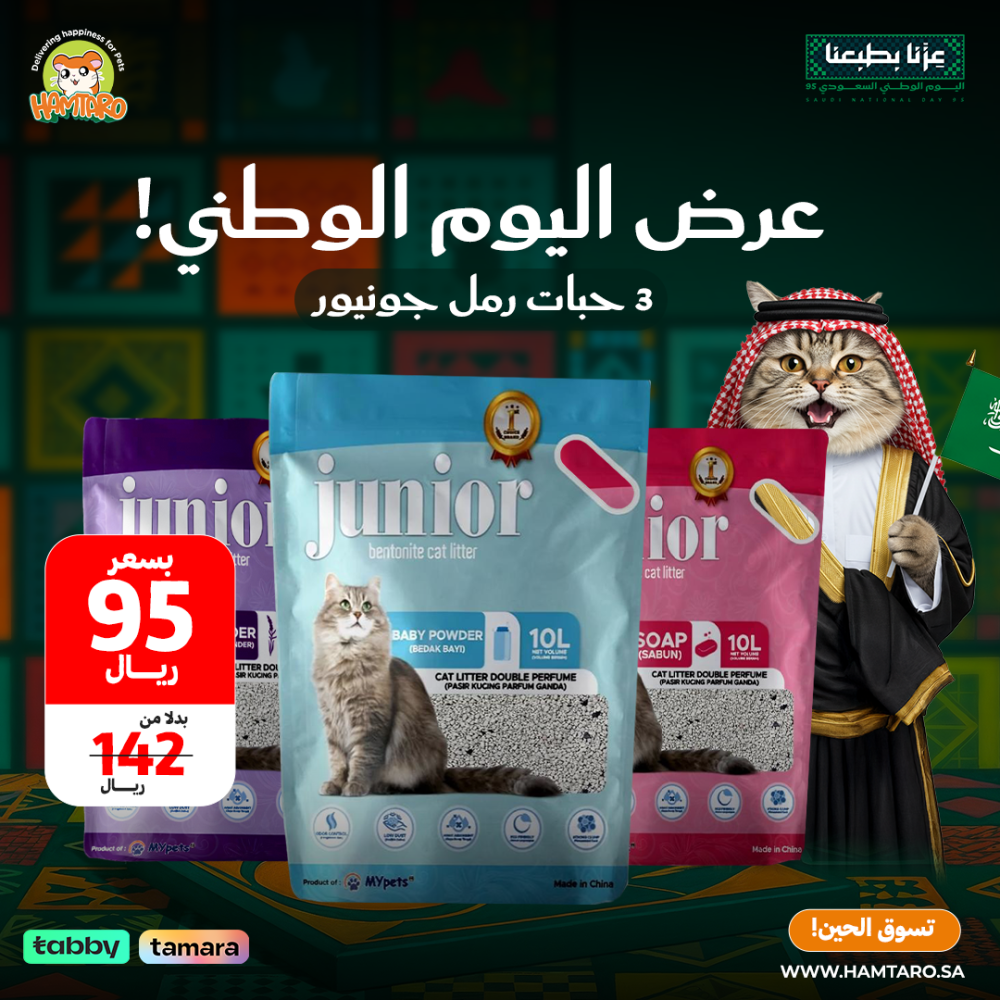 إذا كنت تبحث عن حل متكامل لنظافة قطتك وراحة منزلك، فإن عرض اليوم الوطني من رمل القطط جونيور مكس 10 لتر هو الاختيار الأفضل لك، هذا العرض يجمع بين الجودة العالية والتنوع المميز في الروائح، حيث يقدم لك باقة متكاملة من أفضل منتجات رمل جونيور الموثوقة